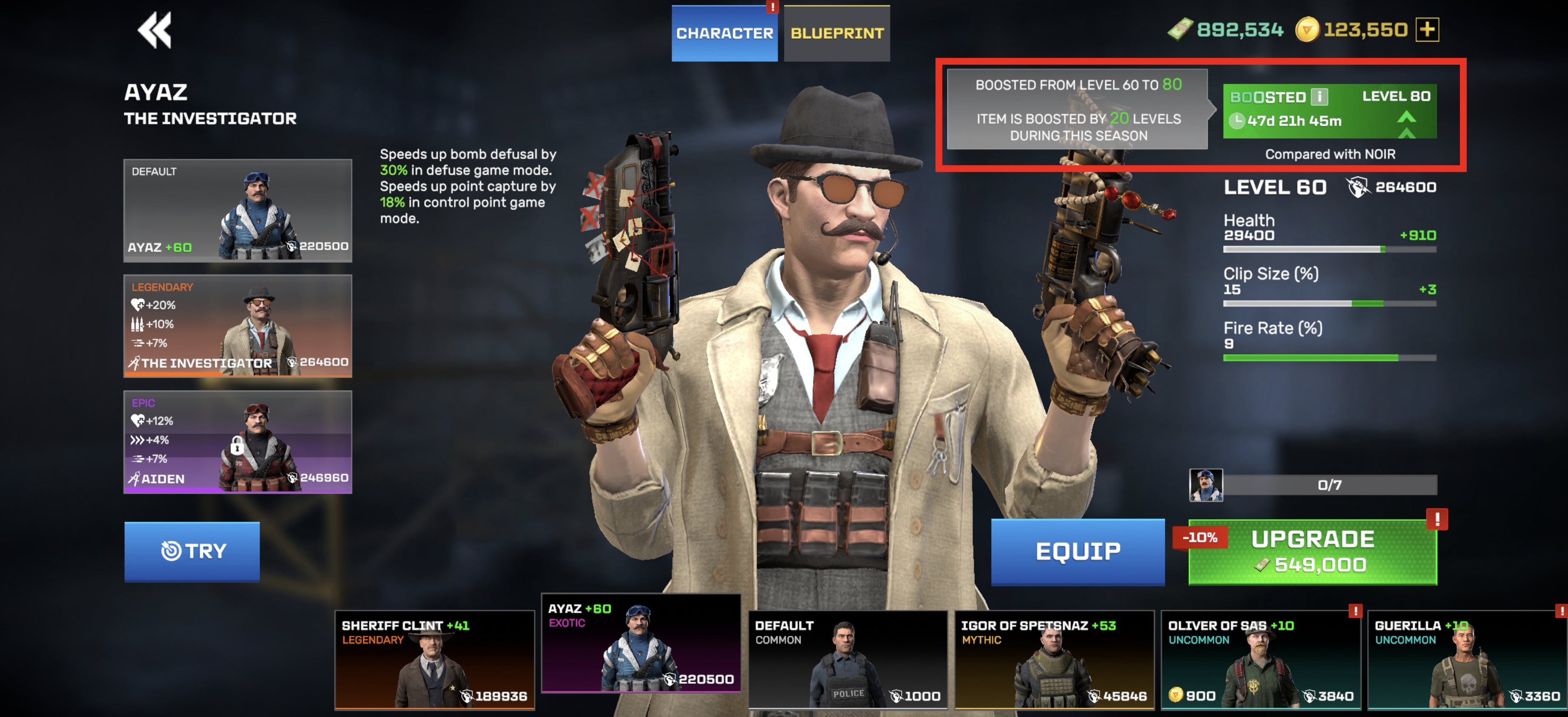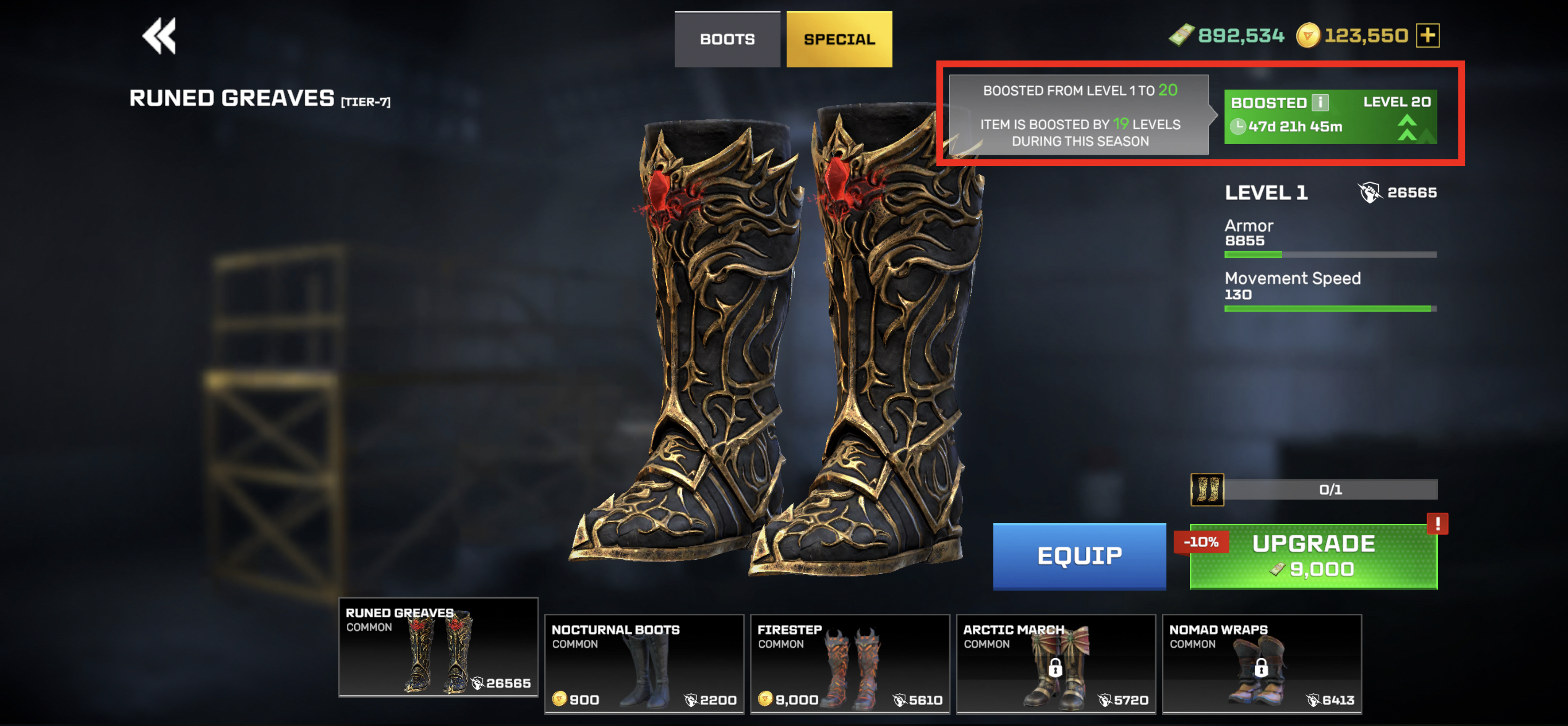 Or, as the AYAZ character and the RUNED GREAVES boots are currently boosted items, and is the highest-level character and boots in your arsenal, they were boosted by +20 levels.