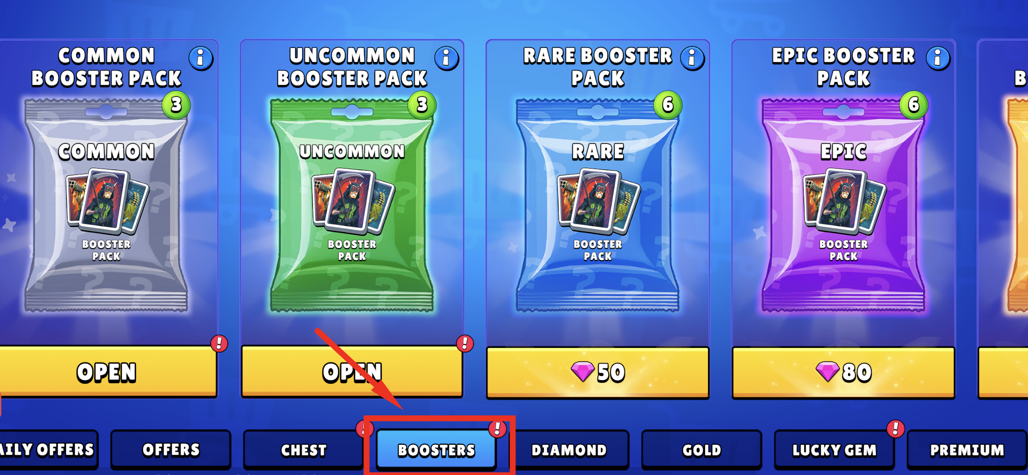 You can collect different Booster Cards by opening Booster Packs in the Shop.