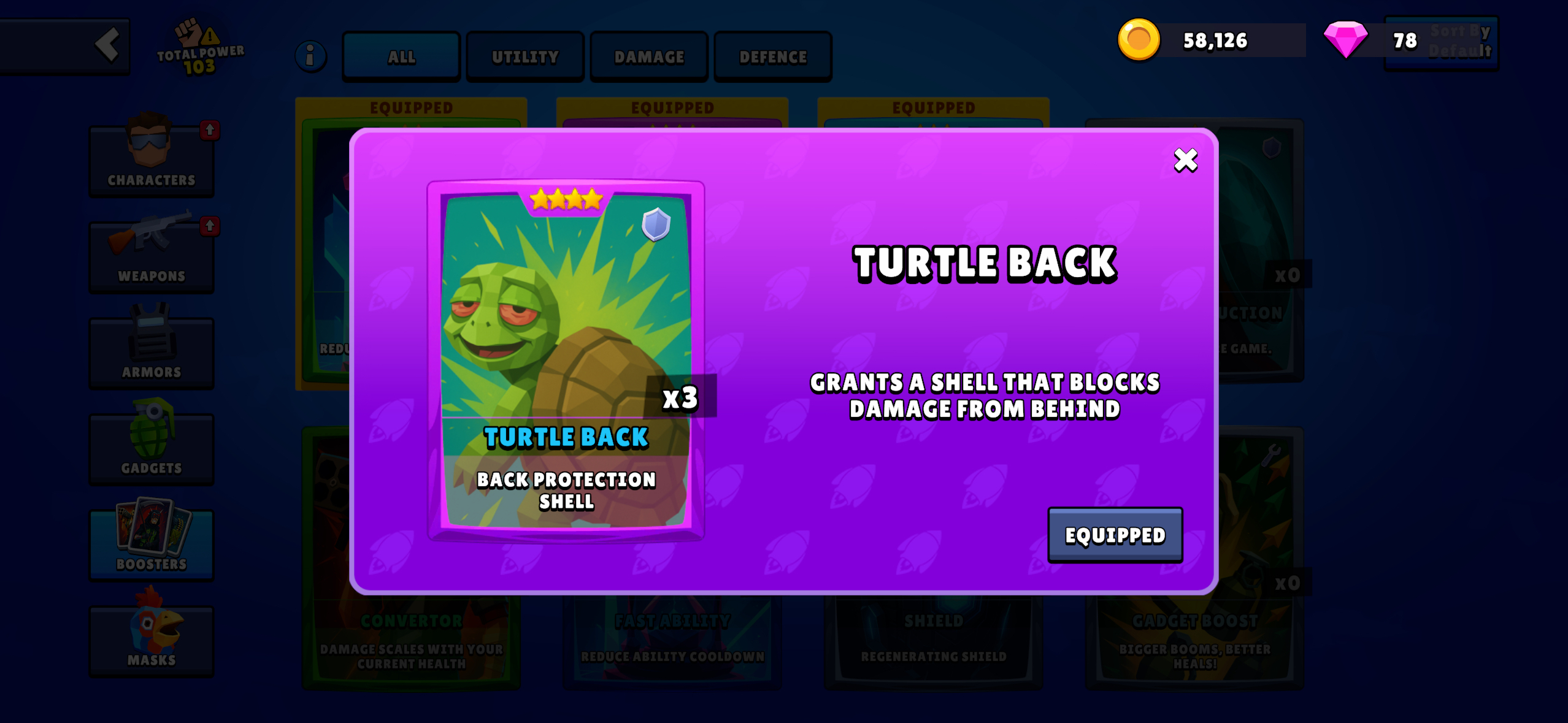 Defence: Provides protection and survivability (e.g., Turtle Back blocks damage from behind).