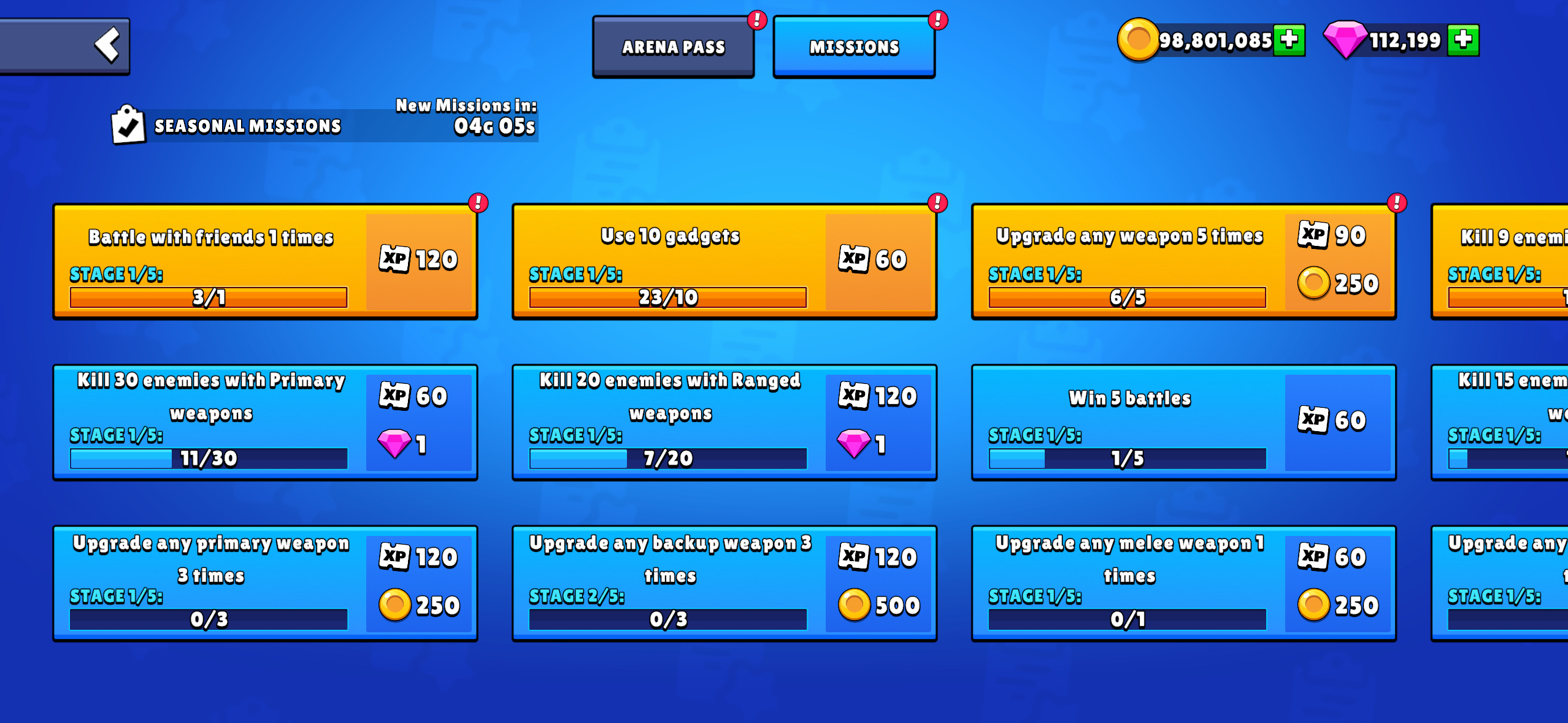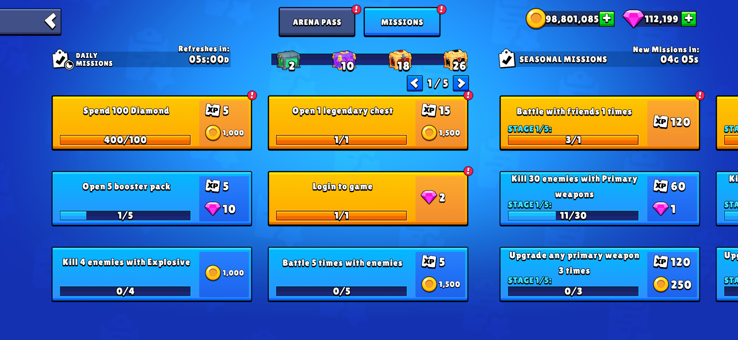 Seasonal Missions (Right): These are long-term challenges that often have multiple stages (e.g., Stage 1/5). Completing these missions typically rewards you with Arena Pass XP and Gold, which are essential for advancing through the arena pass and upgrading your items.
