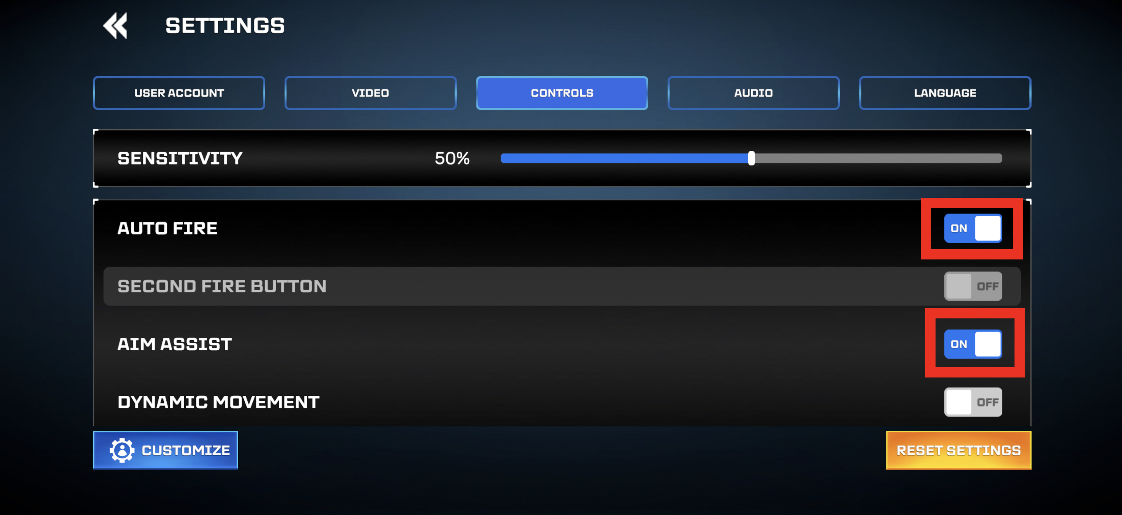 3. Otomatik Ateş ve Nişan Yardım özelliklerini kapatmak için ON/OFF butonlarına bas.