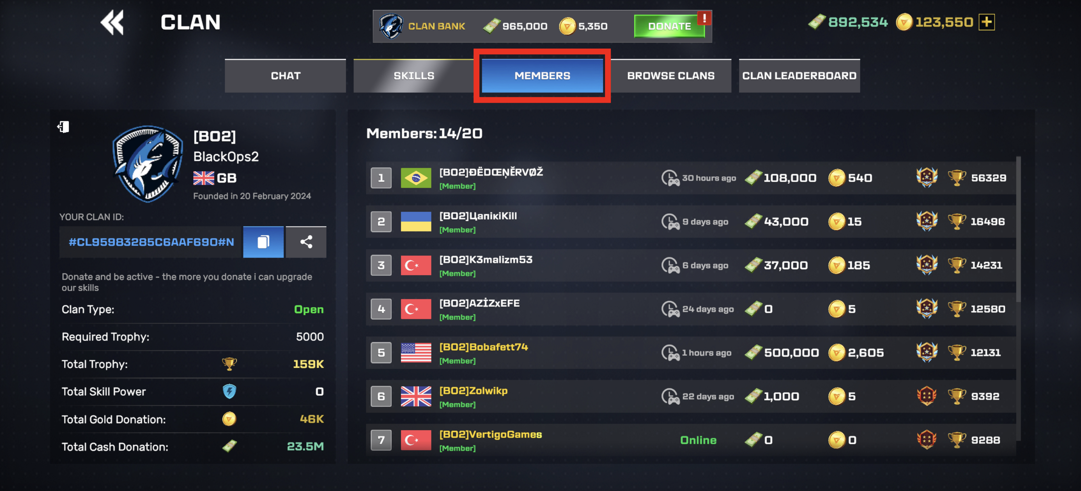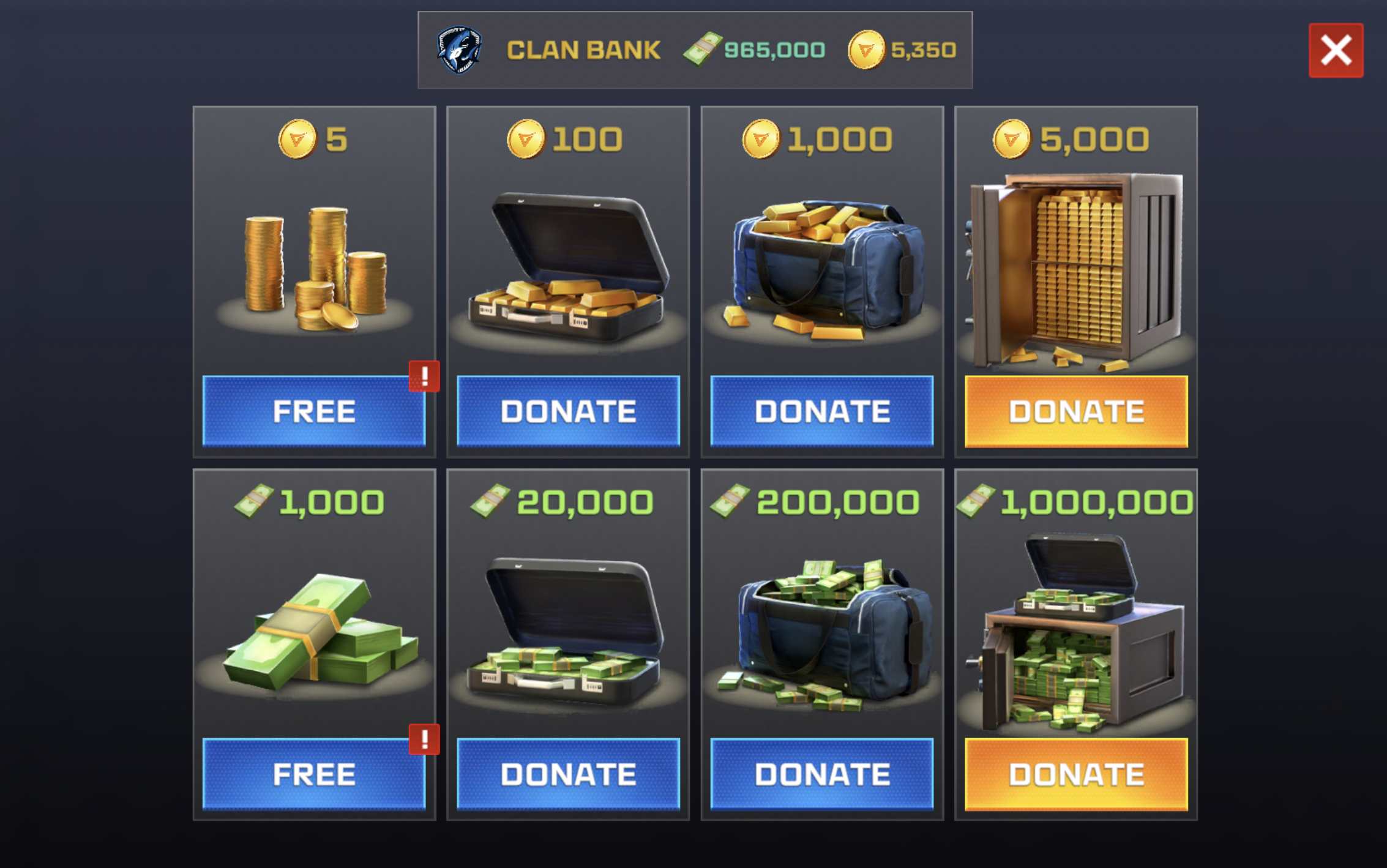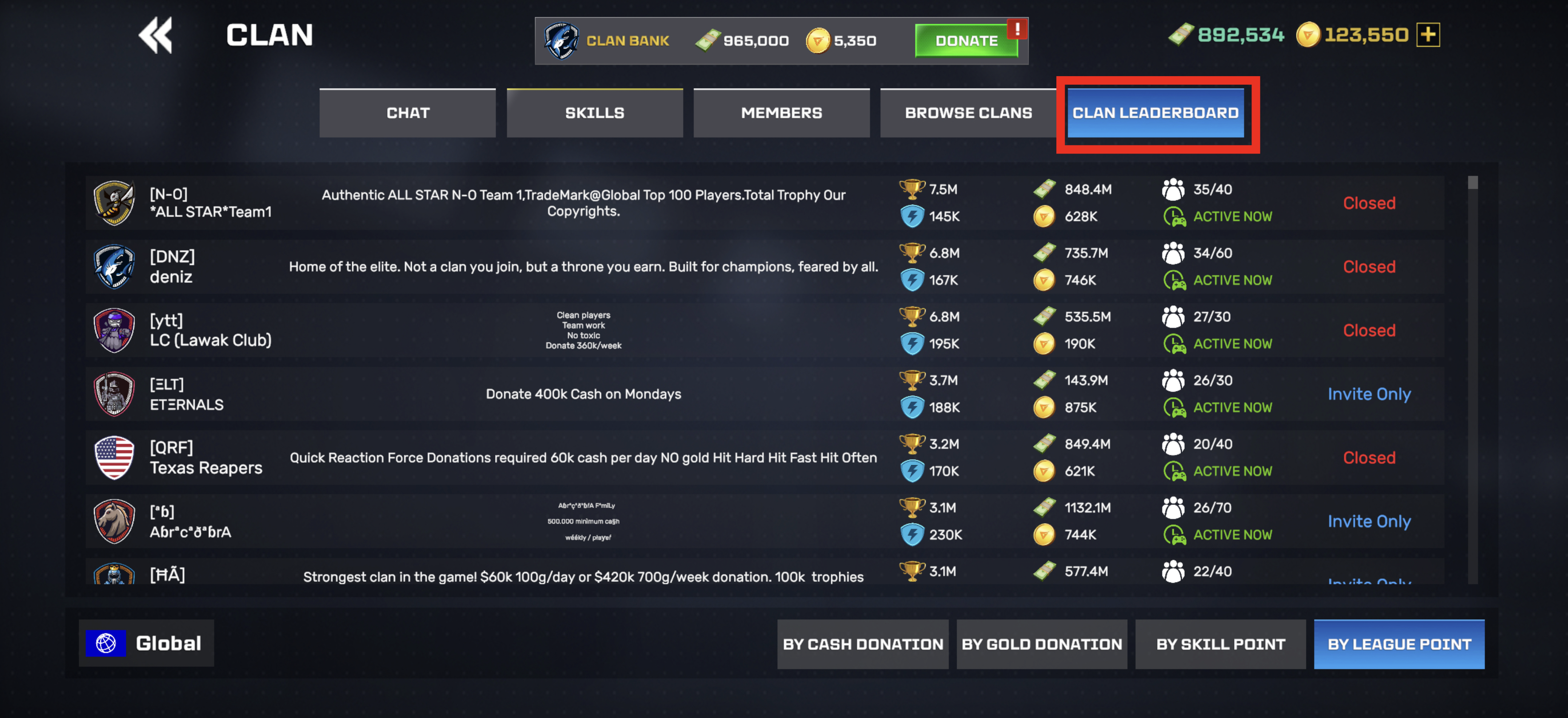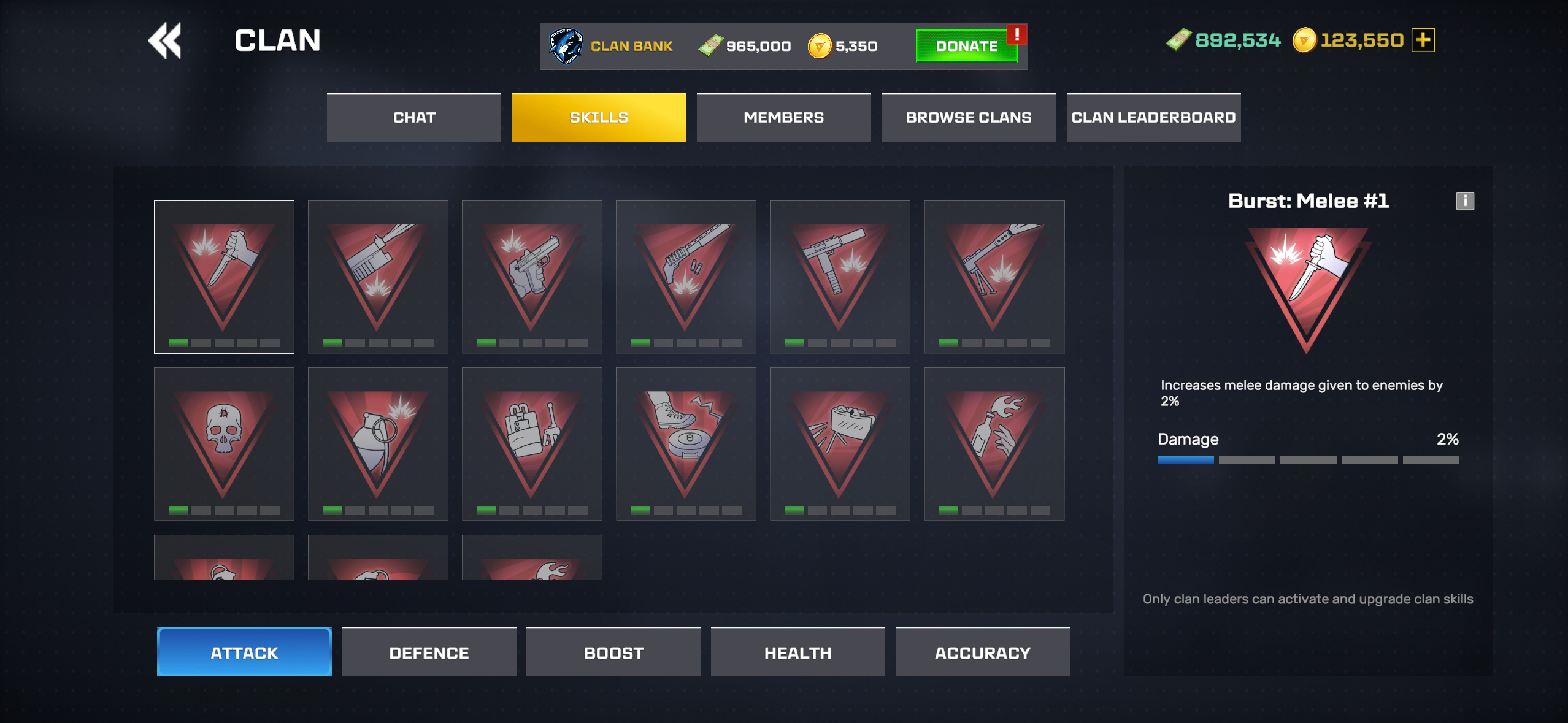 Bu beceriler için klana para ve altın bağışları yapılabilir. Klan lideri, bu bağışları klan becerilerini güçlendirmek için kullanabilirler.