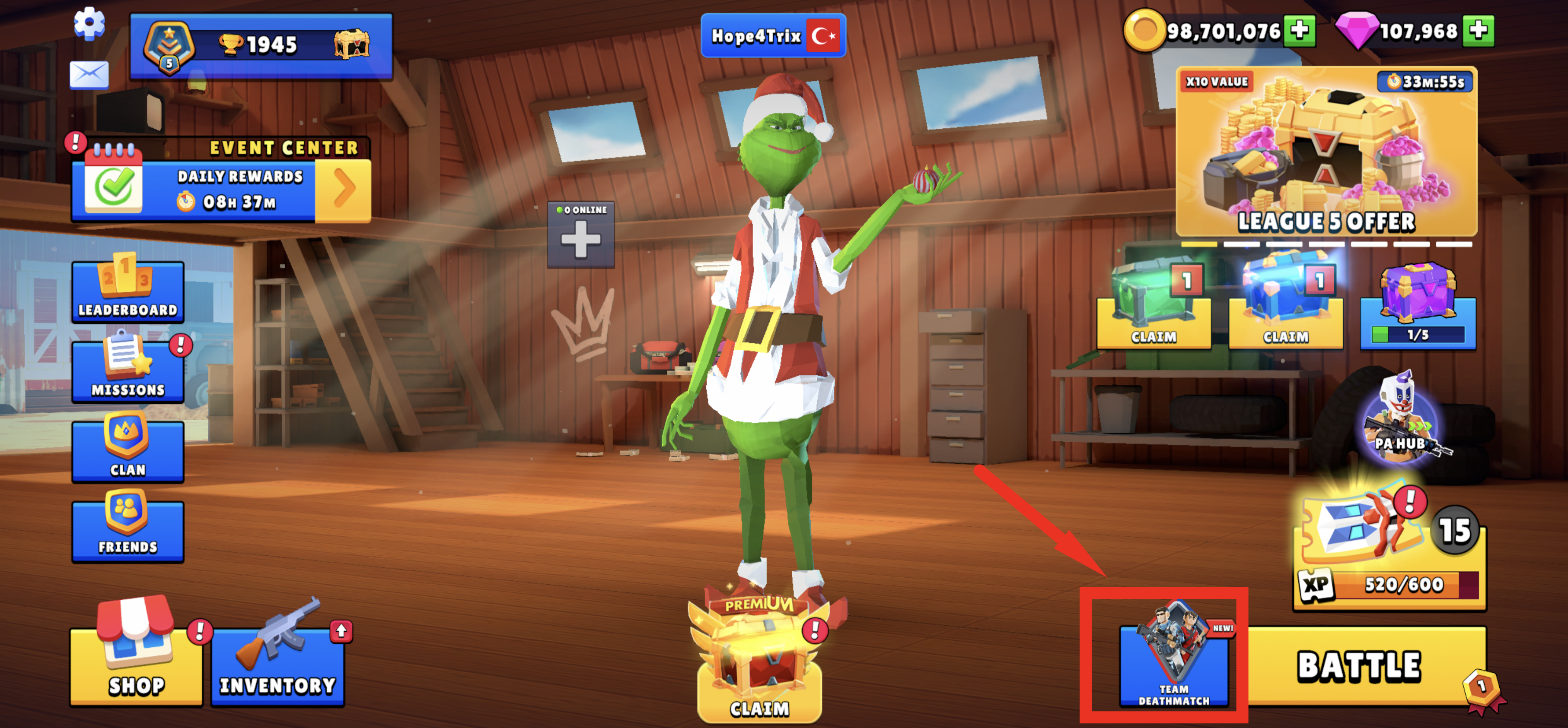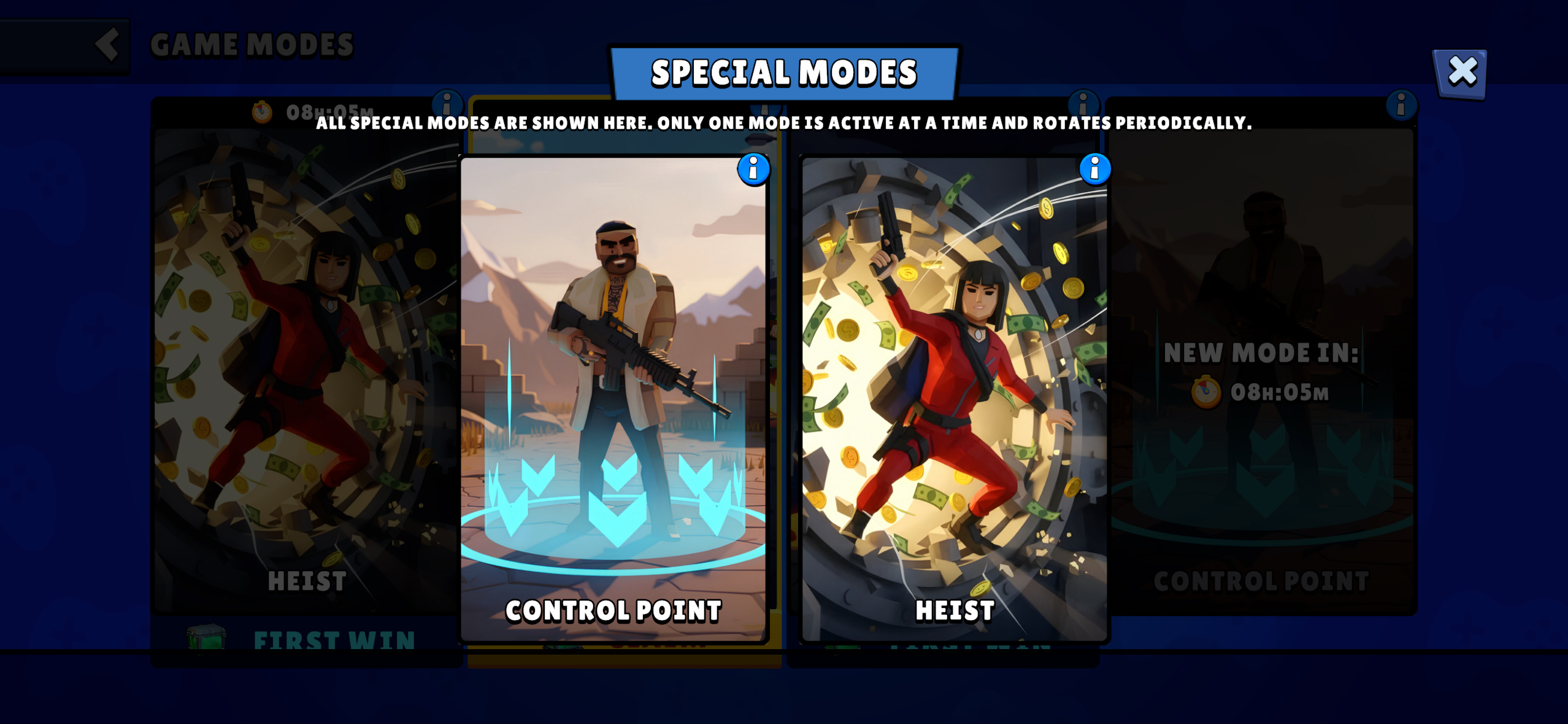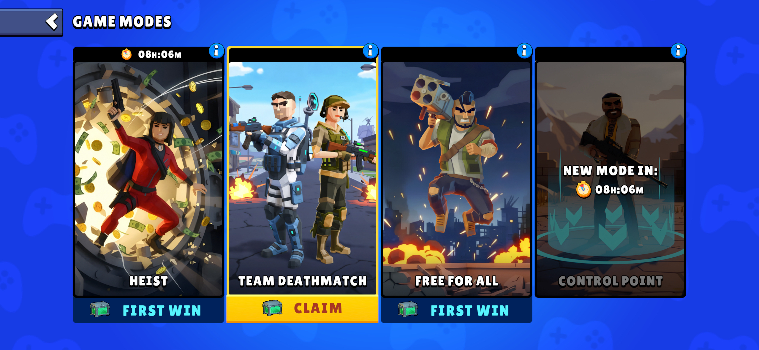 Oyunun ana menüsünün sağ alt bölümünden farklı modları seçebilir ve her oyun moduna özel olarak günün ilk galibiyeti için bonus sandık kazanabilirsiniz. 🔥