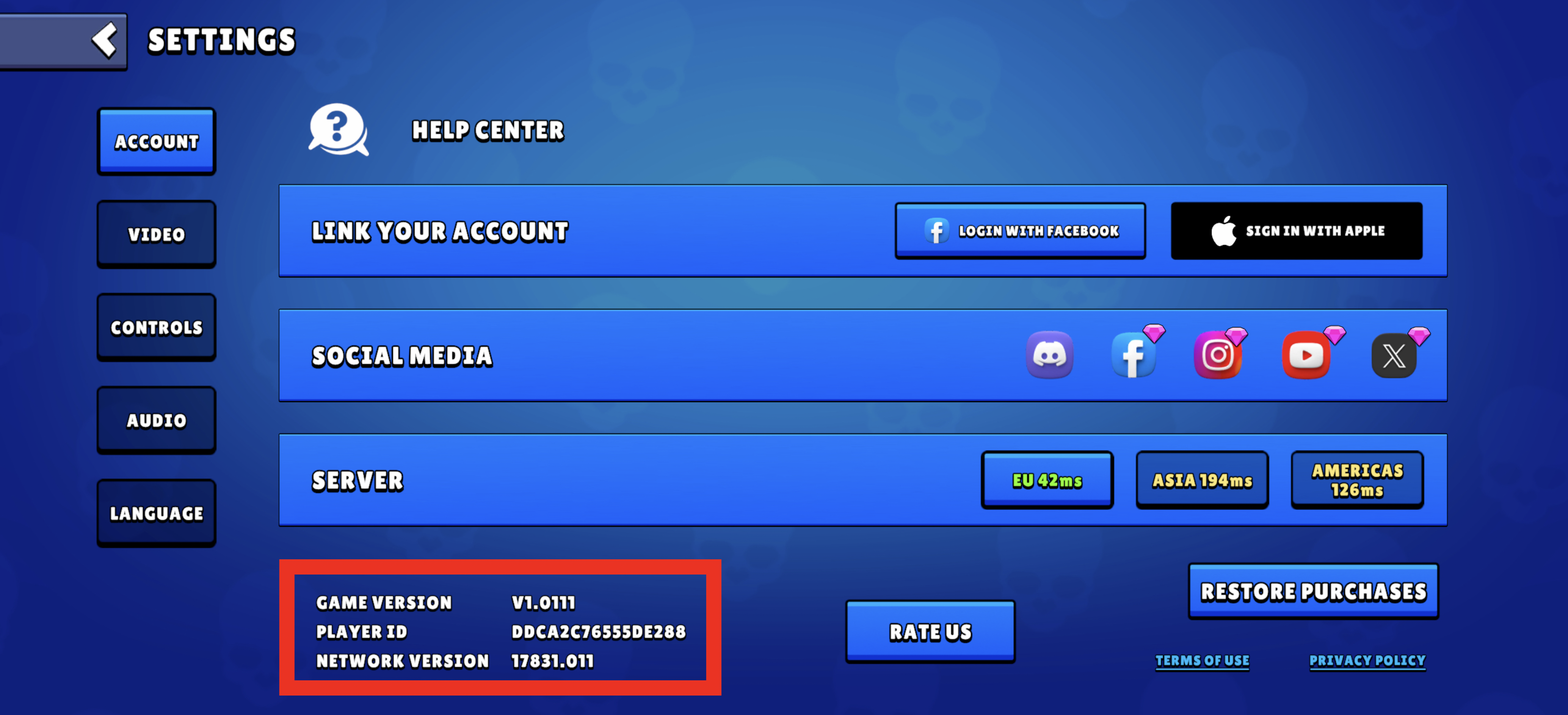 2. HESAP sekmesine git, ekranının sol alt tarafında oyuncu kodun, oyun ve ağ sürümlerini göreceksin. Örneğin: