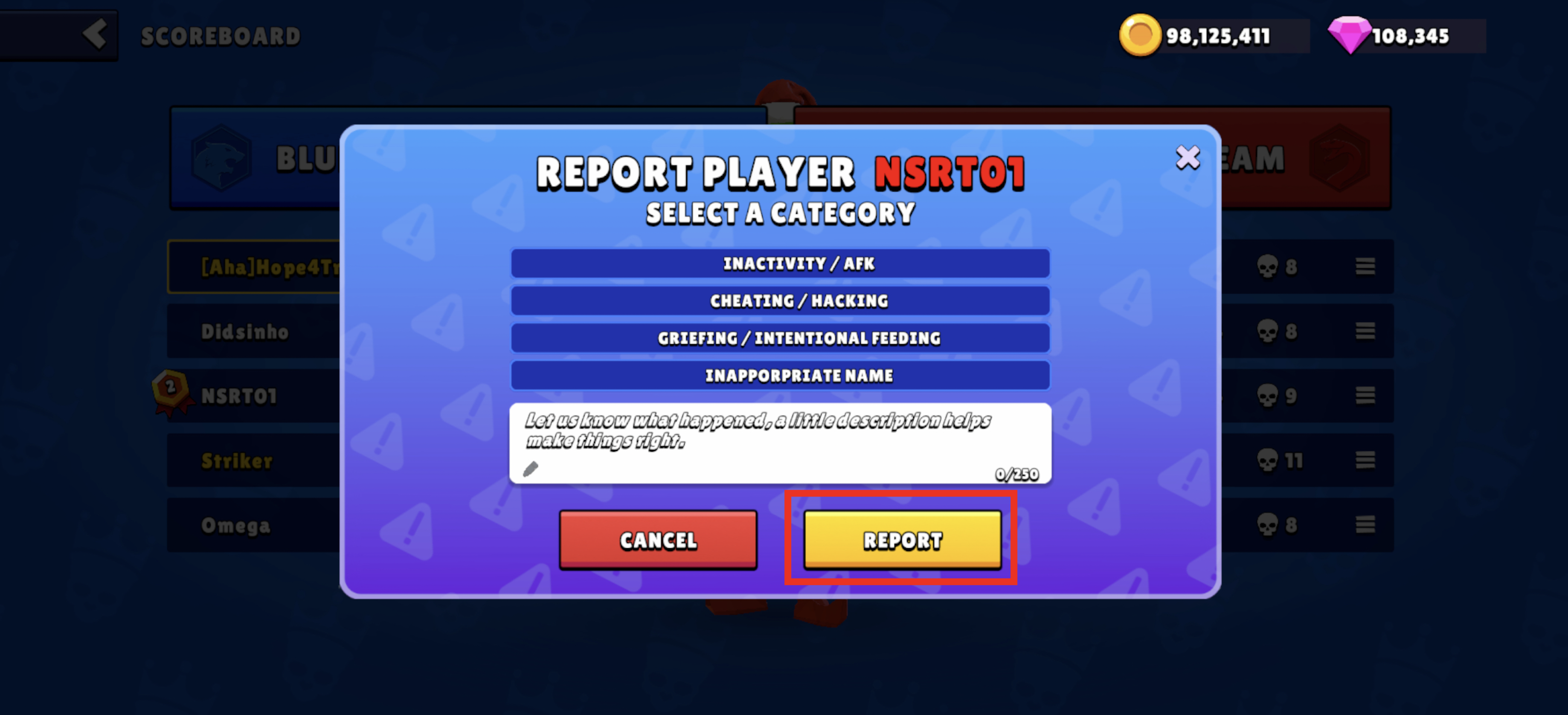 - Açılan menüden Rapor Et seçeneğini seçin. Gelen pencerede, oyuncuyu hangi kategoride şikayet edeceğinizi belirleyin ve durumu kısaca açıklayın.